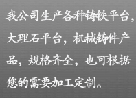 全意铸铁平台平板厂家专注生产T型槽铸铁平台,大理石气浮实验石平台,han接铸铁平台,装配铸铁平台,检测测量大理石平台,试验铸铁平台,测量大理石平板,T型槽平台,电机试验平台,三坐标测量平台等铸铁平板来图加工定做业务,以合理的价格,专注的技术服务于国内外客户,互利合作,共同发展!公司位于河北交河开发区,京沪铁路、104国道、106国道、京福高速公路横穿而过,与我国的两大直辖市北京、天津近在咫尺,地理位置优越,交通非常便利。我公司本着以诚纳客”“严把质量关”“价格优惠”“用户至上的原则,几十年兢兢业业,受到用户的一致好评!